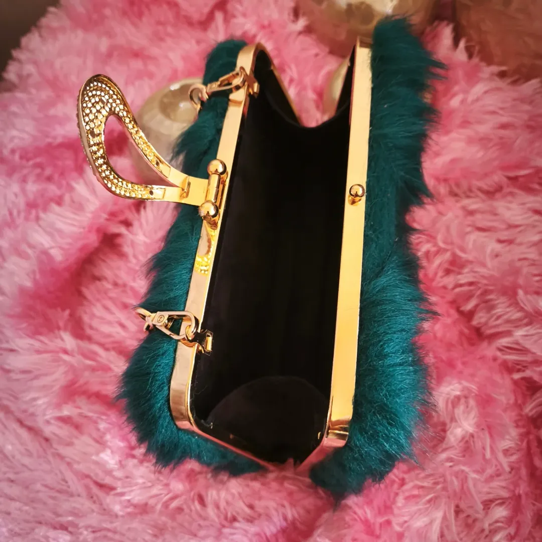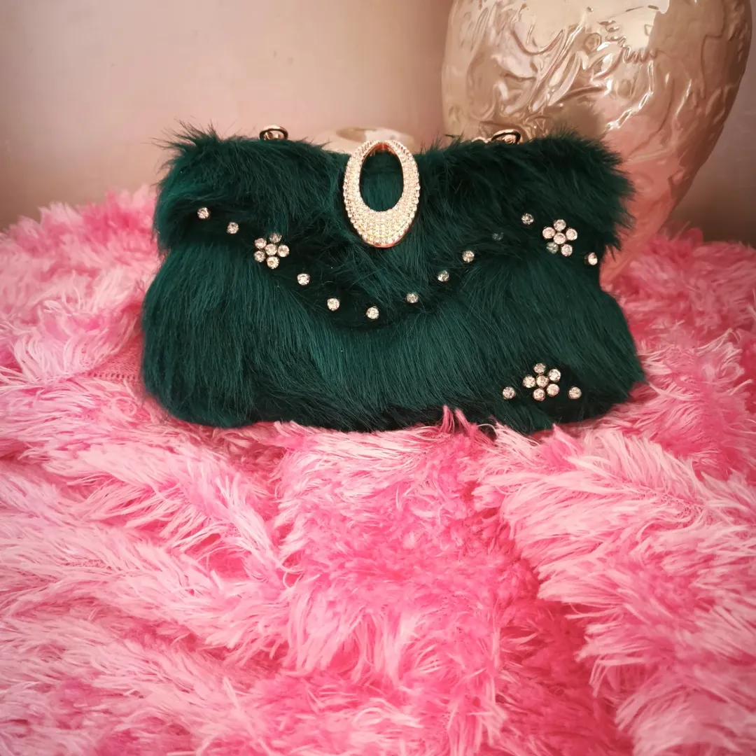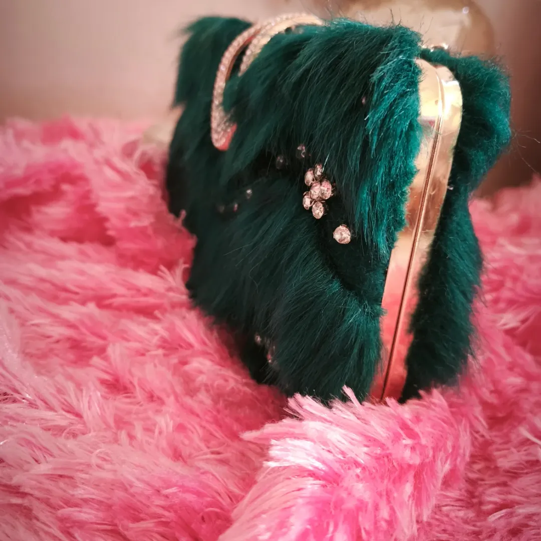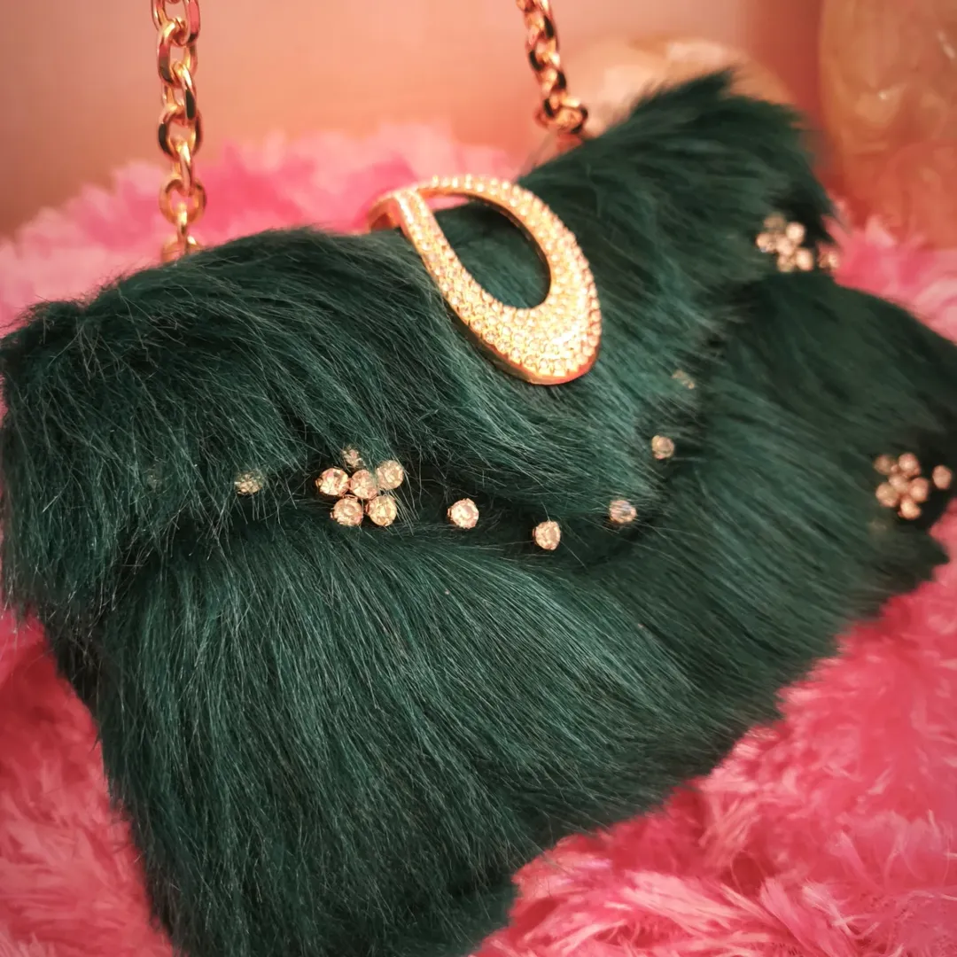 کیف دستساز خزدار رنگ سبز کله غازی کارشده با سنگ دارای زنجیر دوشی کوتاه رنگ طلای اندازه دهانه ۱۹سانت در ۱۲سانت رنگ یراق و زنجیر ثابت است عکسا بدون هیچ گونه فیلتر و فتوشاپی گرفته شده.