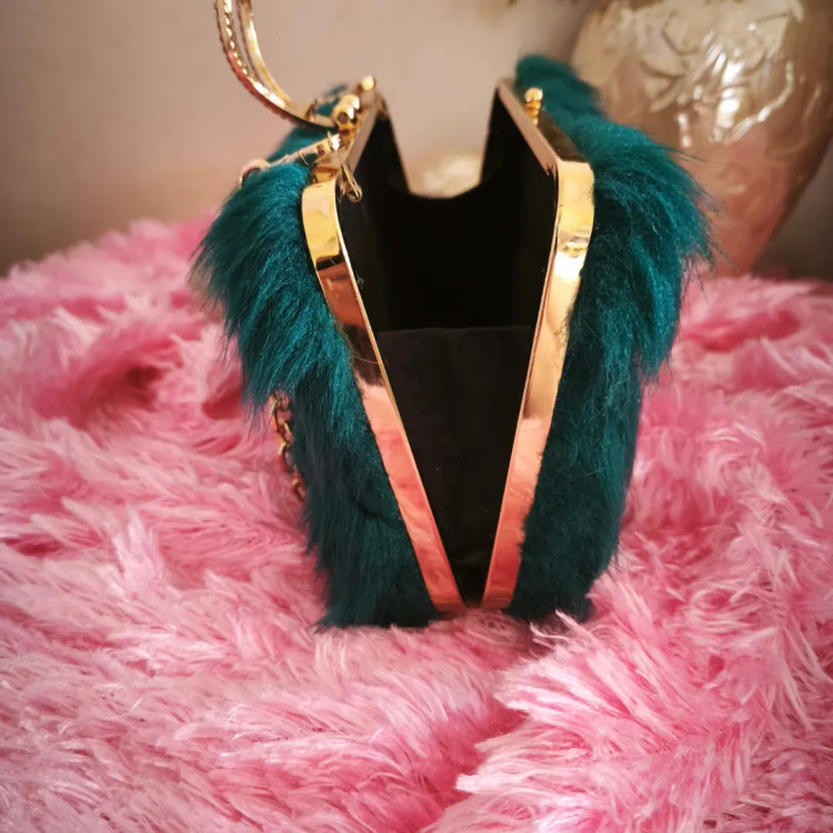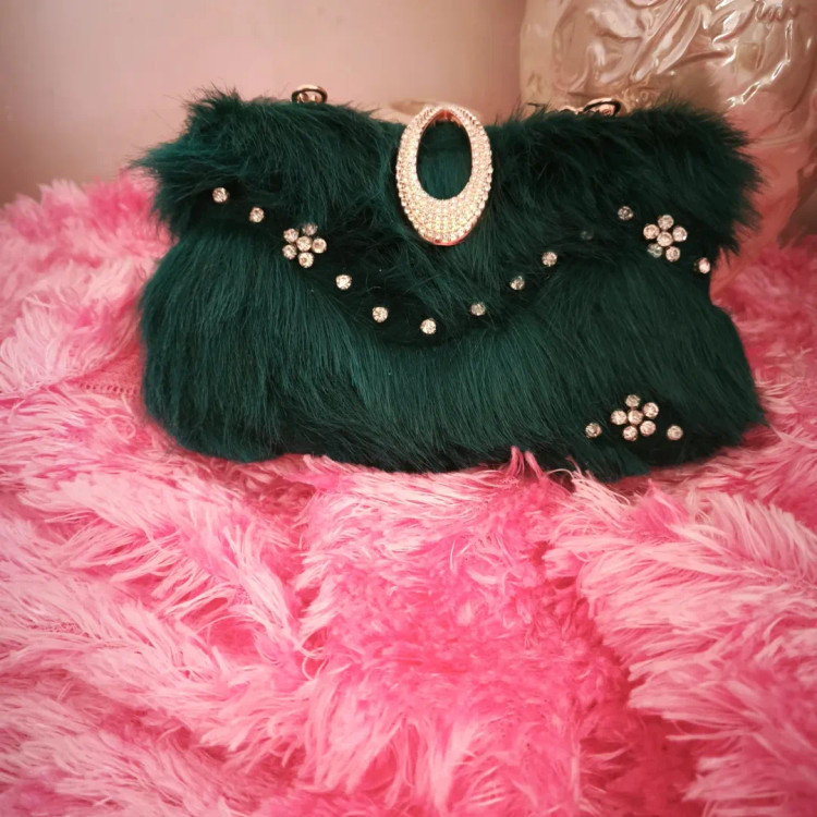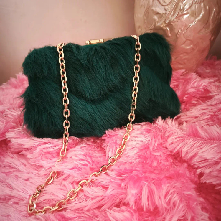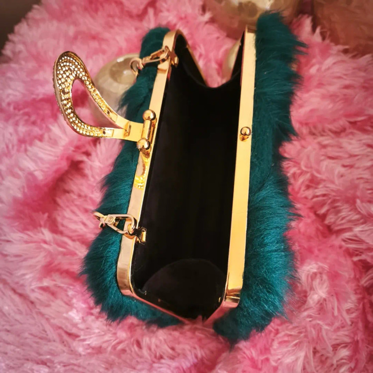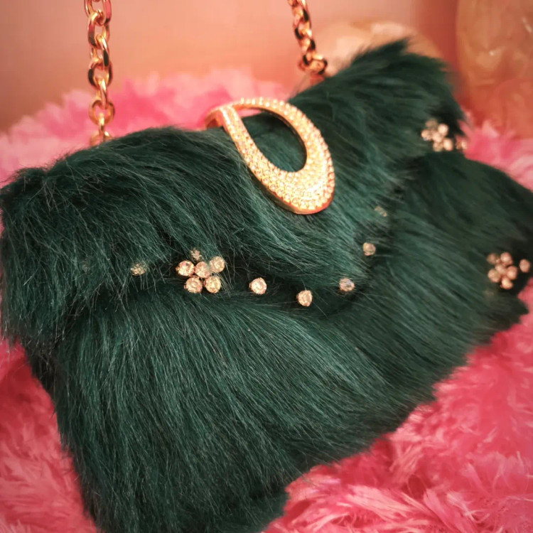 کیف دستساز خزدار رنگ سبز کله غازی کارشده با سنگ دارای زنجیر دوشی کوتاه رنگ طلای اندازه دهانه ۱۹سانت عرض ۵ ارتفاع ۱۳ رنگ یراق و زنجیر ثابت است داخل کیف کار شده با پارچه استری اشبالت عکسا بدون هیچ گونه فیلتر و فتوشاپی گرفته شده.