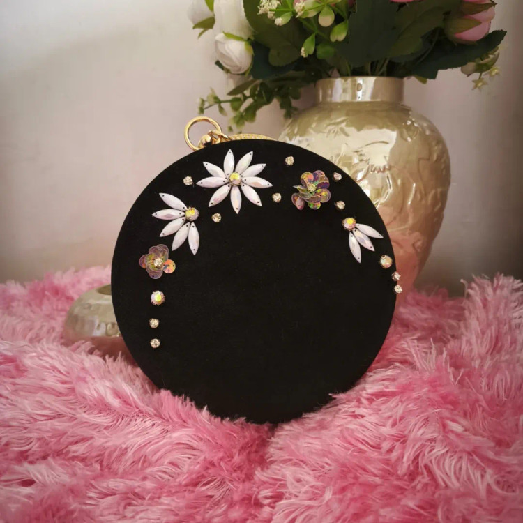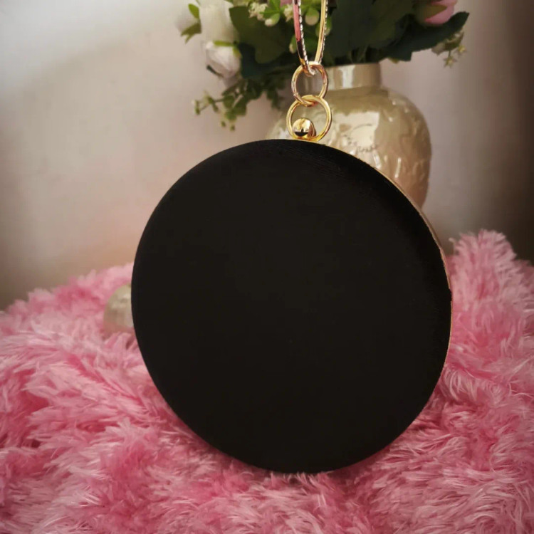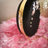 کیف زیبای قابدار دست ساز با پارچه مخمل کارشده با سنگ و پولک دارای دسته حلقه ی طلای رنگ نگین دار و بند دوشی کوتاه طلای.