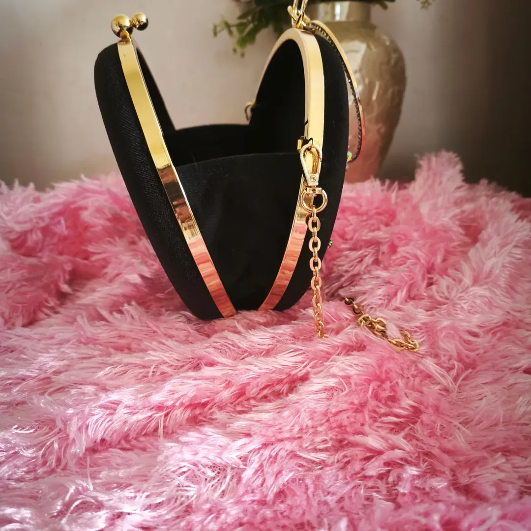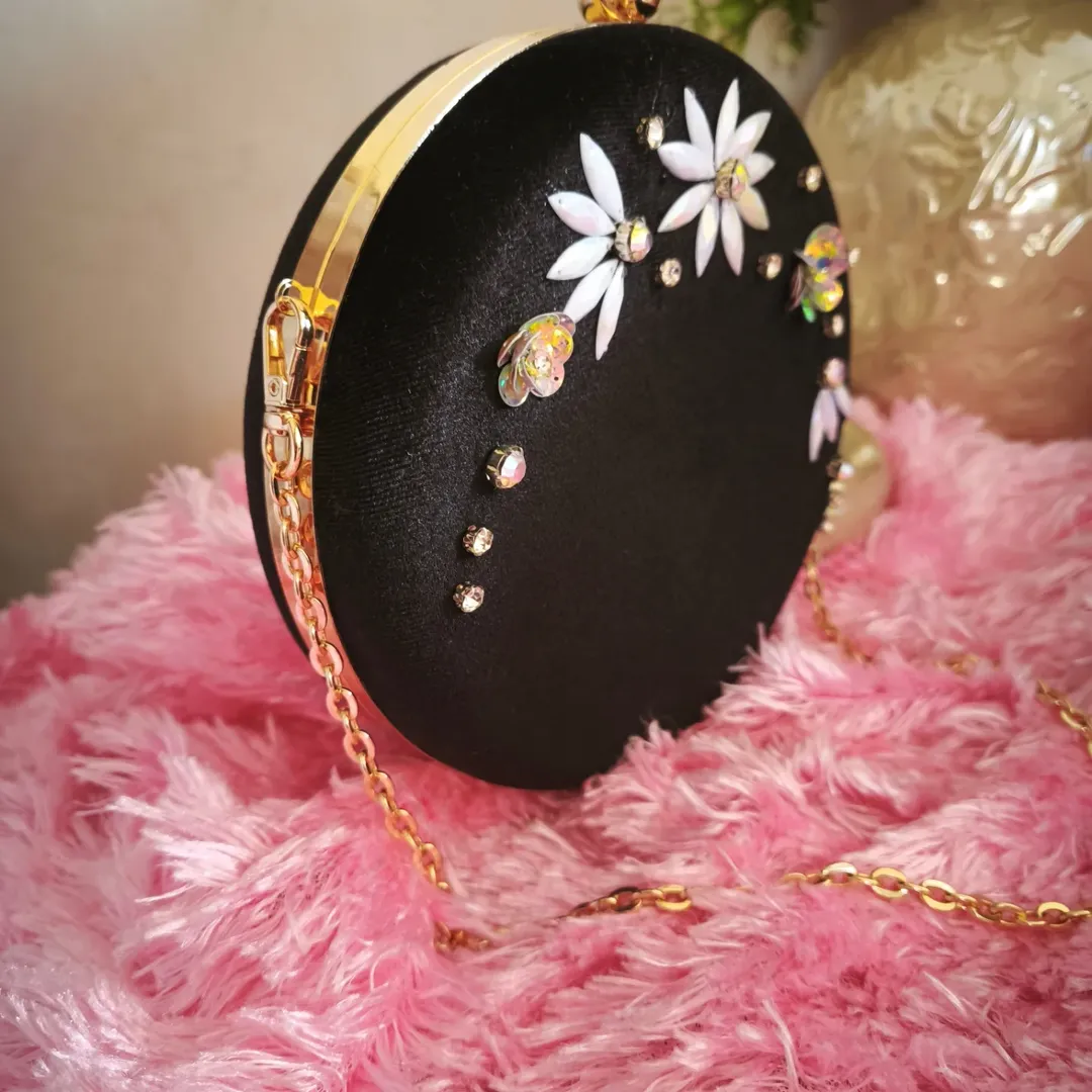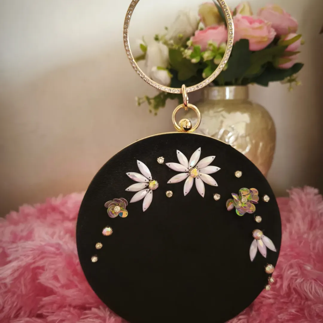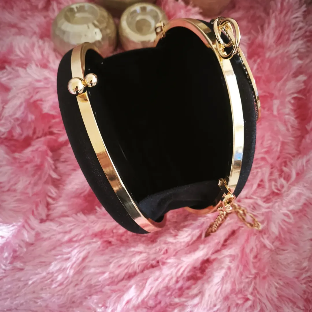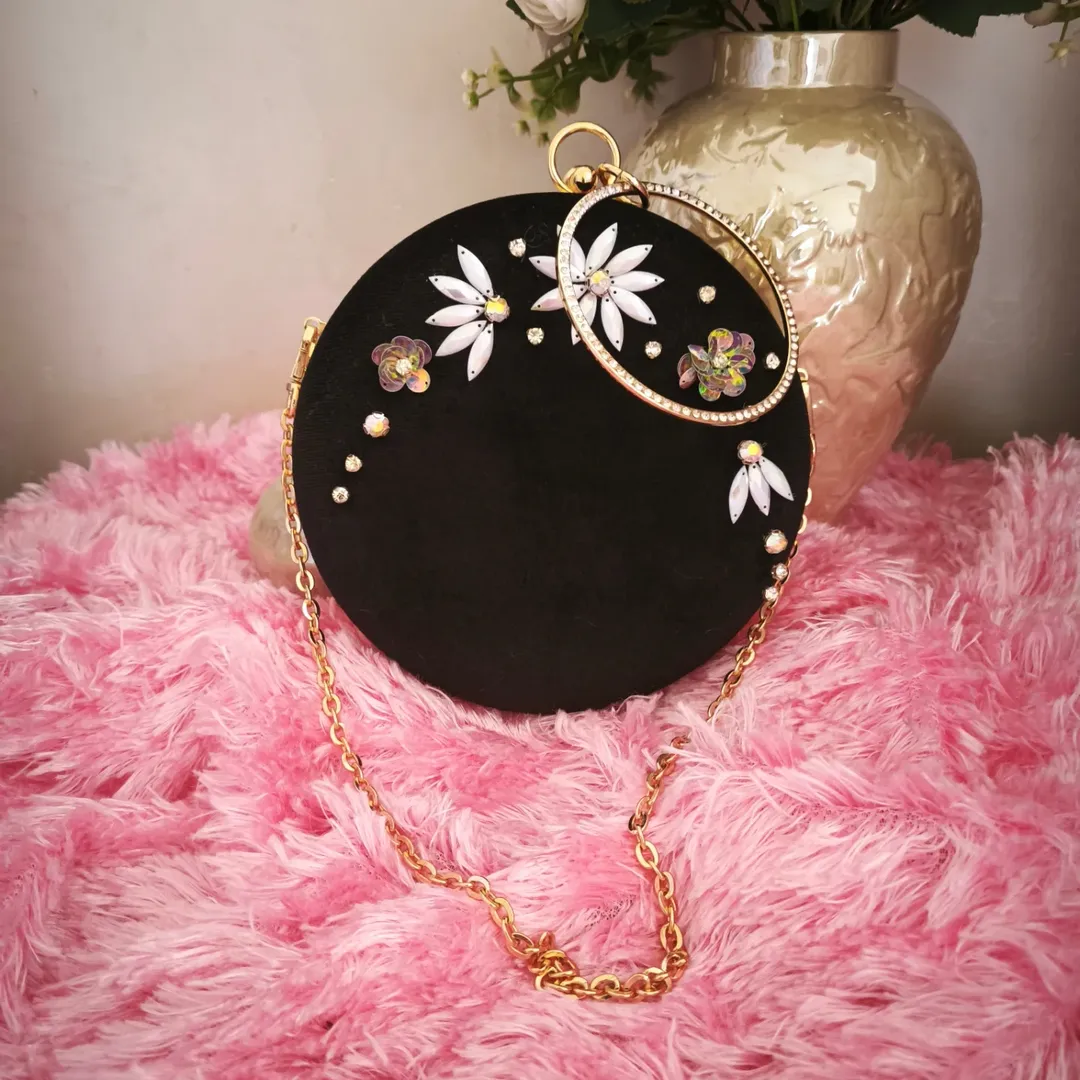 کیف زیبای قابدار دست ساز با پارچه مخمل کارشده با سنگ و پولک دارای دسته حلقه ی طلای رنگ نگین دار و بند دوشی کوتاه طلای.