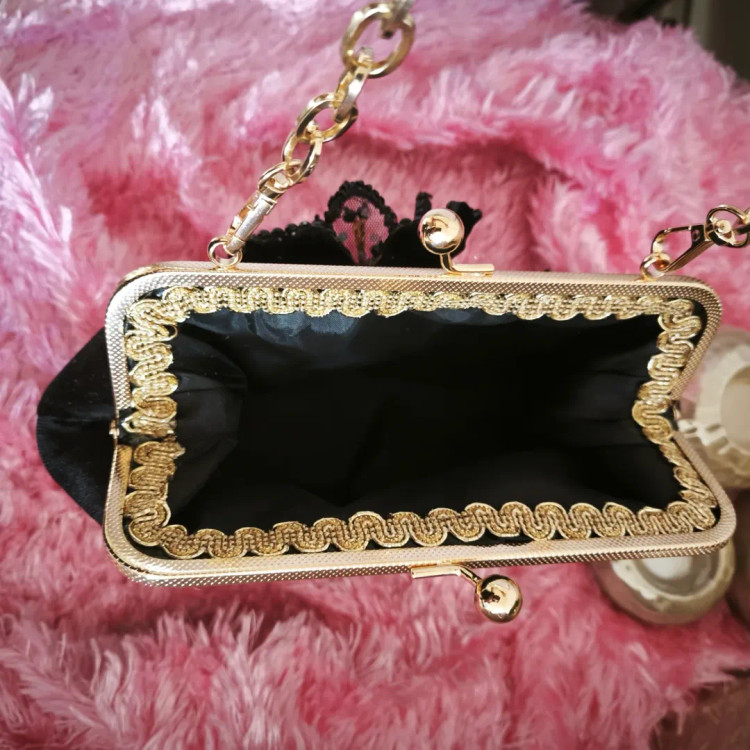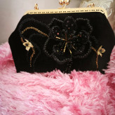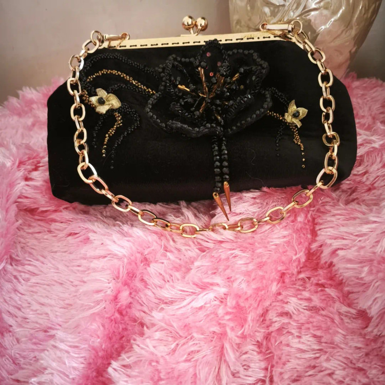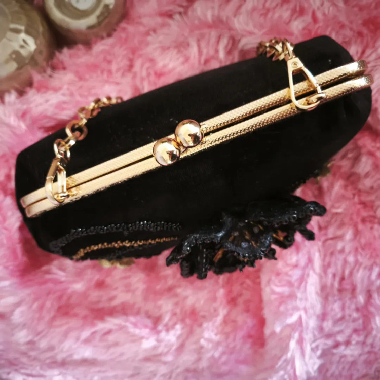 کیف دست دوز با پارچه مخمل رنگ مشکی منجوق دوزی و گل برجسته دارای زنجیر دوشی کوتاه طلای رنگ ،رنگ یراق و زنجیر ثابت است