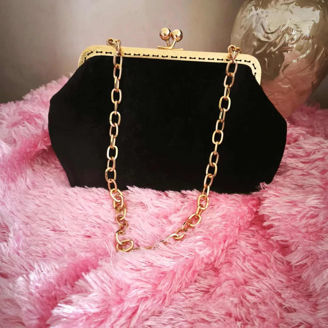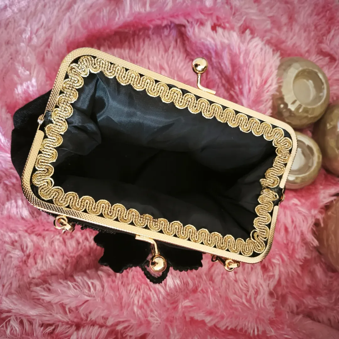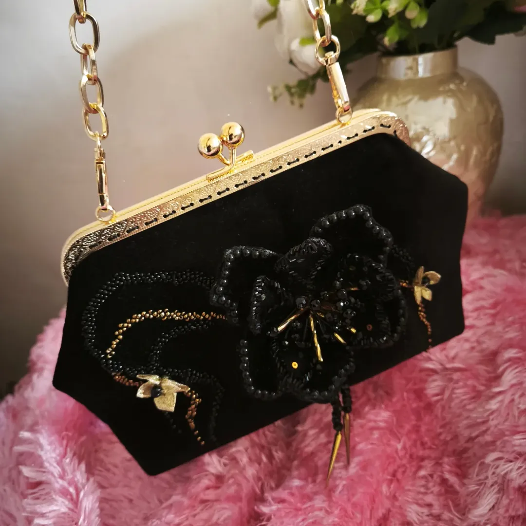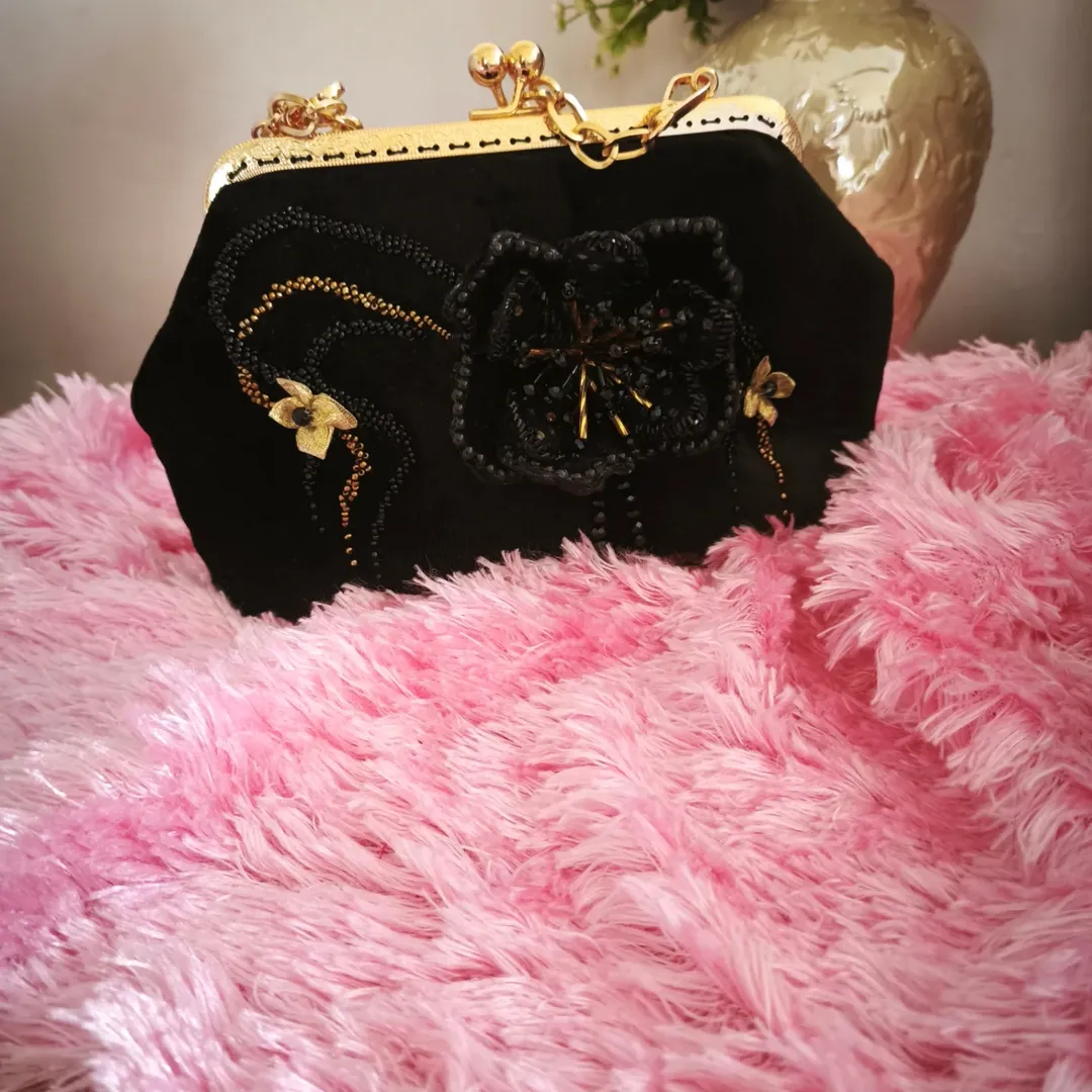 کیف دست دوز با پارچه مخمل رنگ مشکی منجوق دوزی و گل برجسته دارای زنجیر دوشی کوتاه طلای رنگ ،رنگ یراق و زنجیر ثابت است
