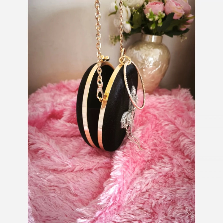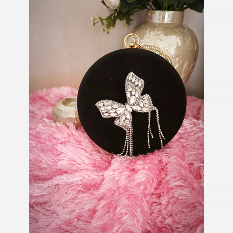 کیف مجلسی زنانه جنس پارچه مخمل مشکی رویه کار اپلیکه طرحه پروانه کار شده داخل کیف استر اشبالت هست ابعاد قطر ۱۸ و عرض ۵ کیف دارای زنجیر دوشی کوتاه به رنگ طلایی هست که رنگ یراق و زنجیر ثابت هست: ۱