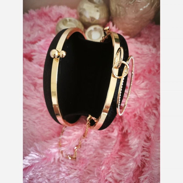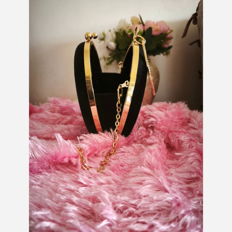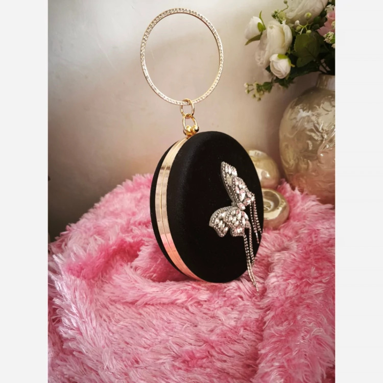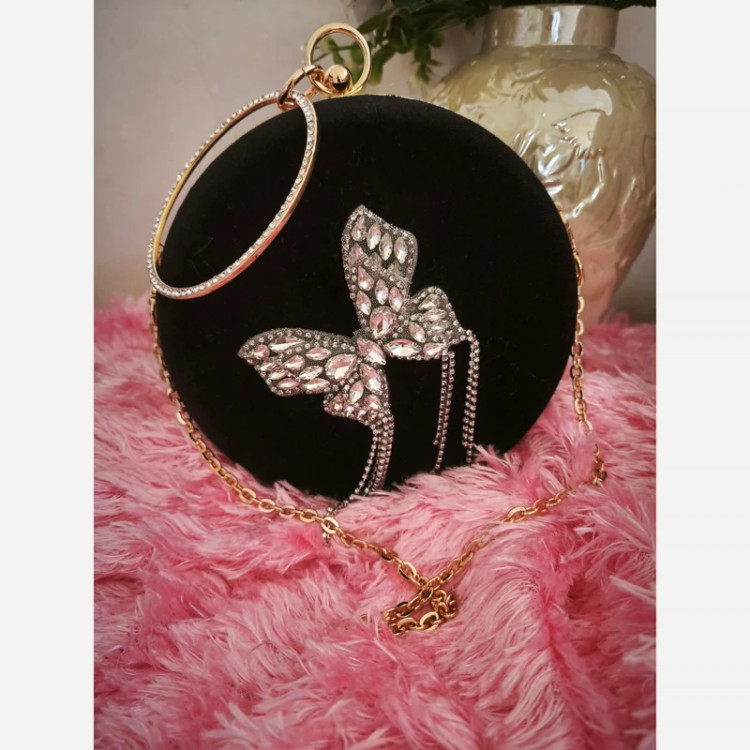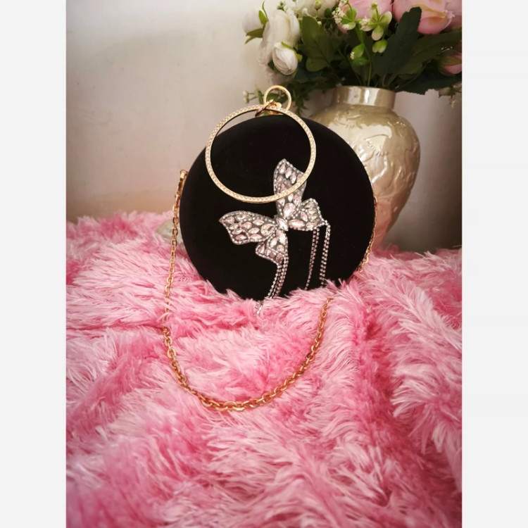 کیف دست ساز هست دارای زنجیر دوشی کوتاه و دسته طلای نگین دار که رنگ یراق و زنجیر ثابت هست جنس کار مخمل رنگ مشکی با پنل سنگ دوزی مدل پروانه ،مناسب مهمانی ها و مجالس