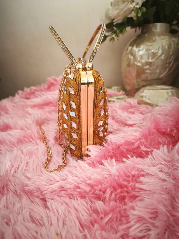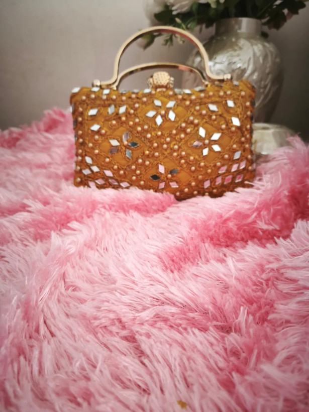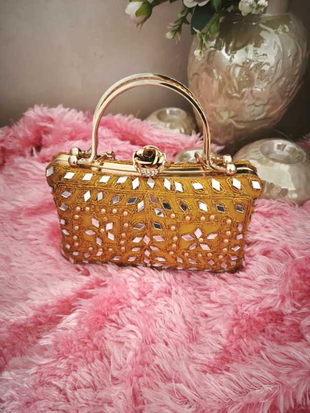 کیف مجلسی زنانه آینه کاری هندی دست سازمون رنگ خردلی دارای زنجیر دوشی کوتاه و دسته طلای رنگ ثابت مناسب مهمانی عکسها بدون هیچ فیلتر و فتوشاپی گرفته شده است