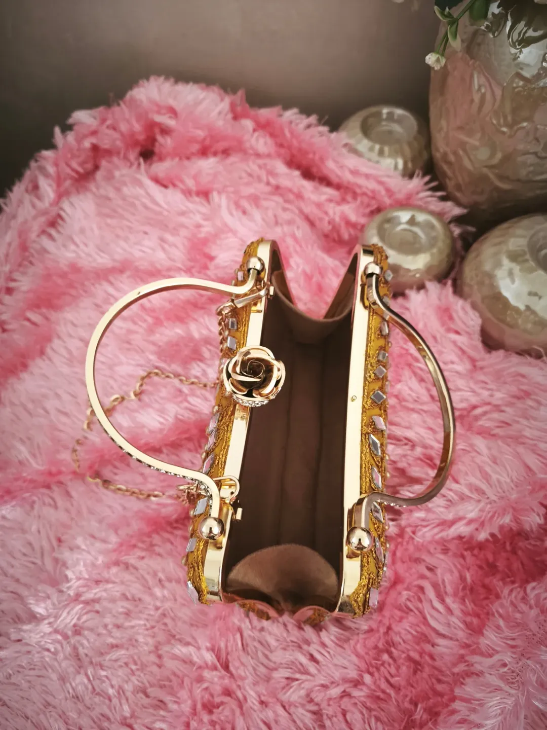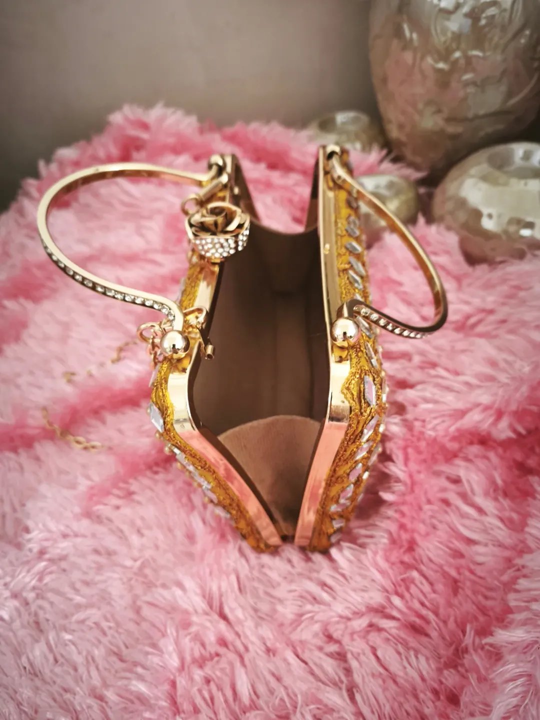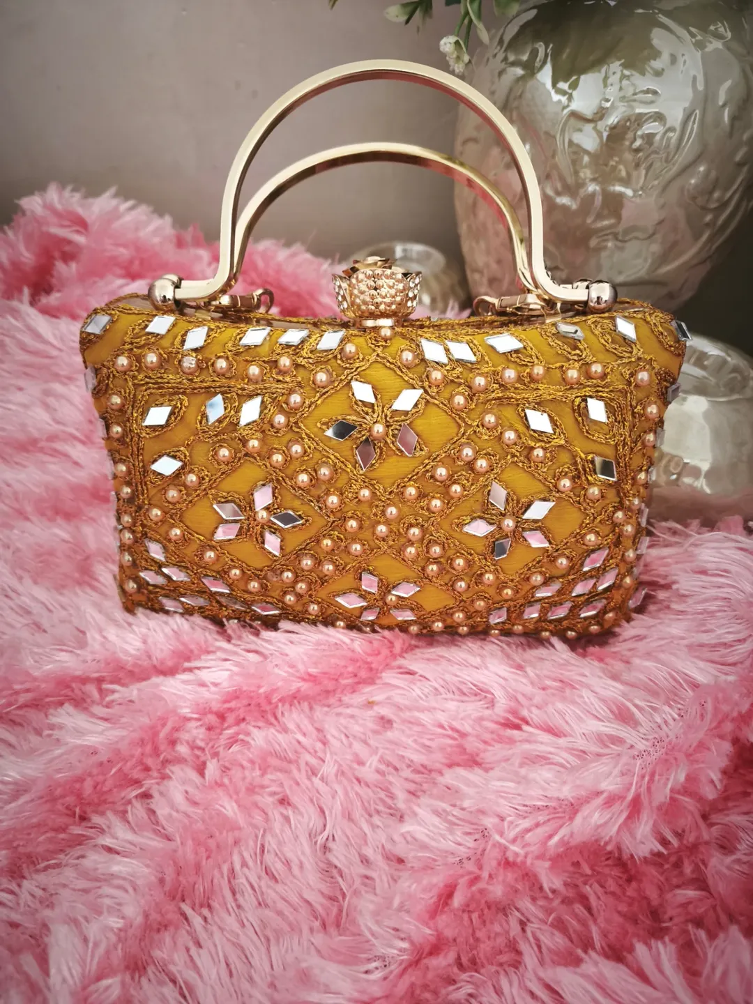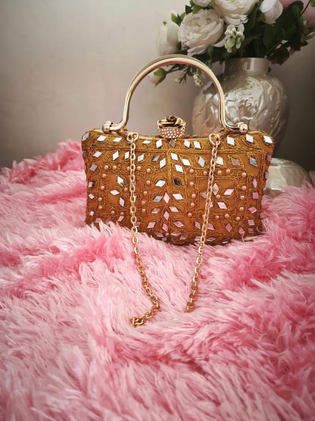 کیف مجلسی زنانه آینه کاری هندی دست سازمون رنگ خردلی دارای زنجیر دوشی کوتاه و دسته طلای رنگ ثابت مناسب مهمانی عکسها بدون هیچ فیلتر و فتوشاپی گرفته شده است