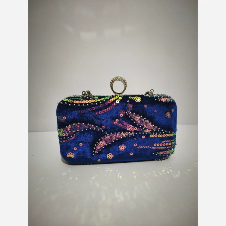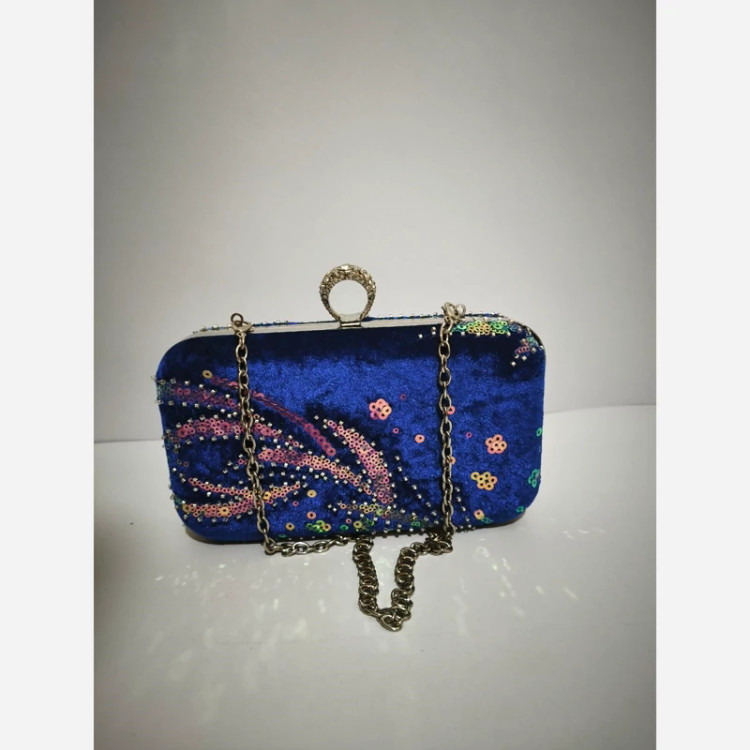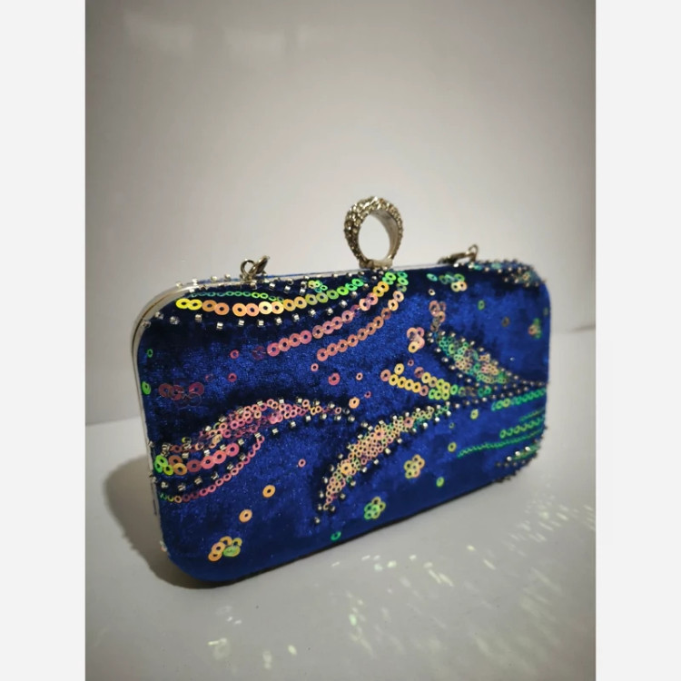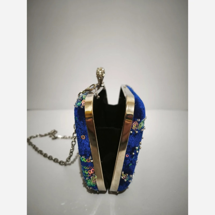 کیف مجلسی دست ساز هست که پارچه مخمل رنگ آبی کاربی هست با طرح منجوق و پولک دوزی ،پولک ها هفت رنگ هست پارچه آستر داخل کیف پارچه اشبالت رنگ مشکی هست دارای زنجیر دوشی کوتاه نقره ای سگک کیف طرح انگشتری نگین دار هست رنگ یراق و زنجیر نقره ای ثابت هست کیف مناسب مجالس و مهمونی هاست
