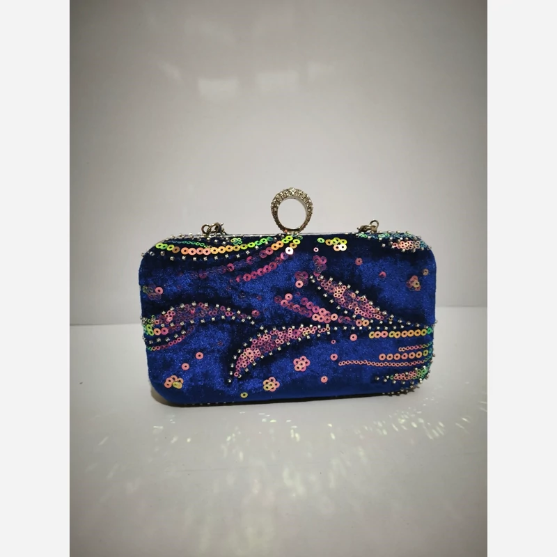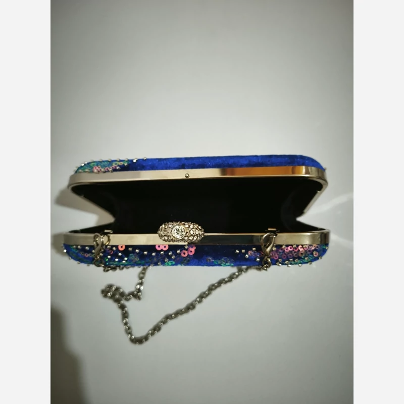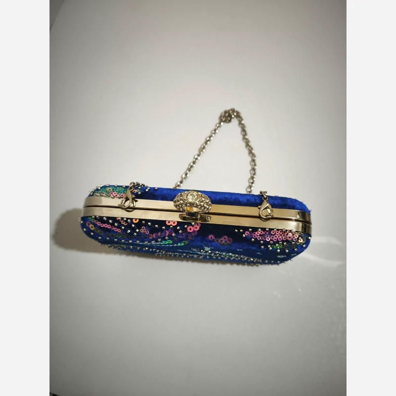 کیف مجلسی دست ساز هست که پارچه مخمل رنگ آبی کاربی هست با طرح منجوق و پولک دوزی ،پولک ها هفت رنگ هست پارچه آستر داخل کیف پارچه اشبالت رنگ مشکی هست دارای زنجیر دوشی کوتاه نقره ای سگک کیف طرح انگشتری نگین دار هست رنگ یراق و زنجیر نقره ای ثابت هست کیف مناسب مجالس و مهمونی هاست