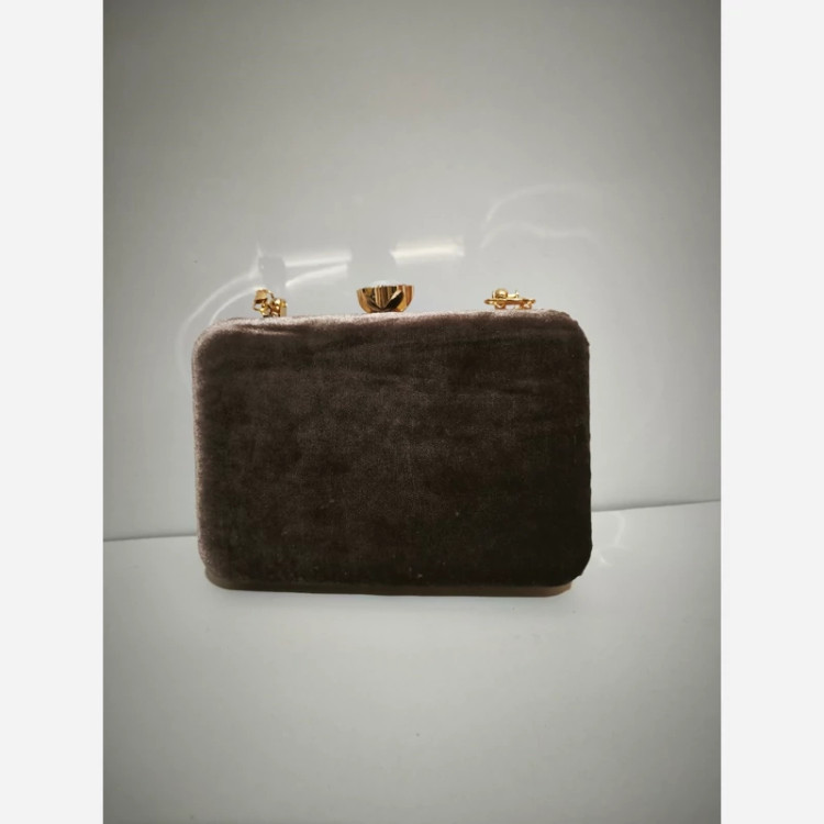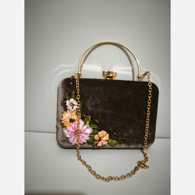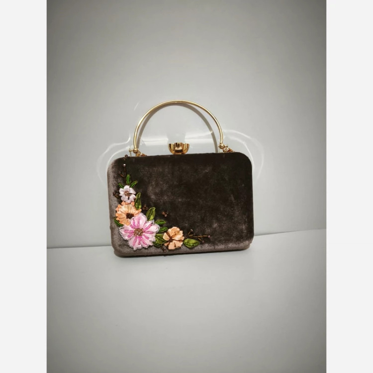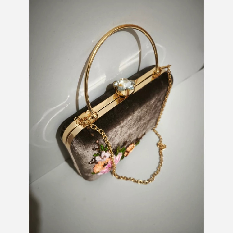 جنس کیف مخمل رنگ قهوه ای روشن با طرح گل روباندوزی و مونجوق دوزی: ۱