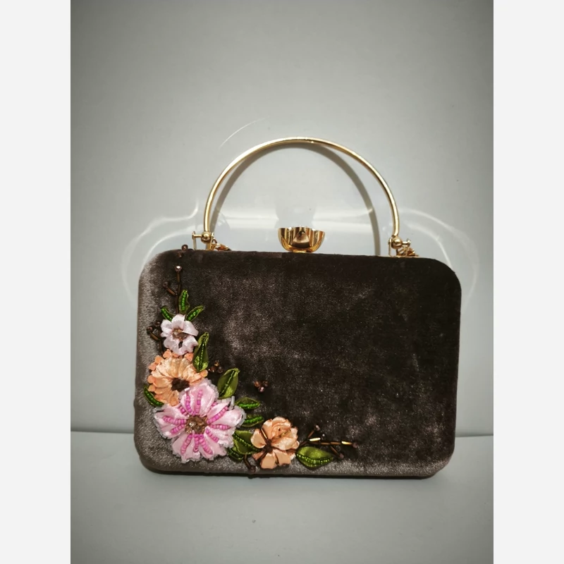 جنس کیف مخمل رنگ قهوه ای روشن با طرح گل روباندوزی و مونجوق دوزی: ۱