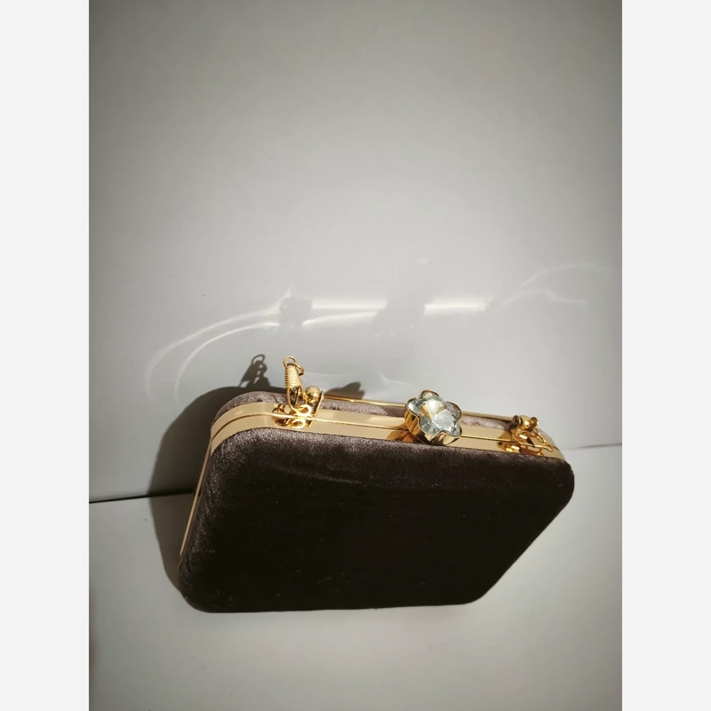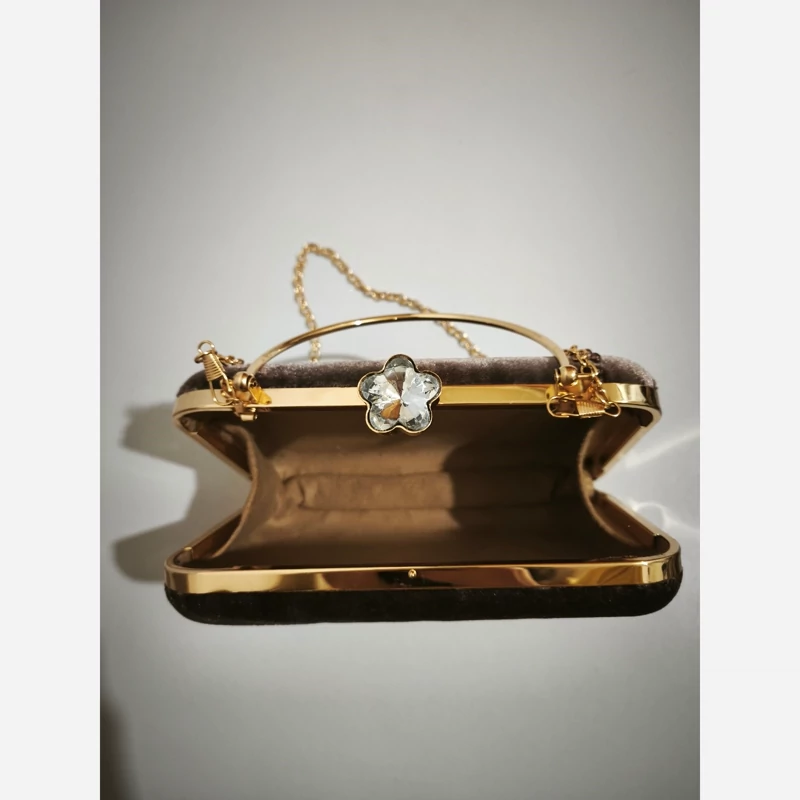 کیف دستساز مجلسی زنانه جنس پارچه مخمل قهوه ای روشن هست روی کار روبان دوزی و منجوق دوزی کار شده داخل کیف پارچه آستری اشبالت رنگ مشکی هست دارای دسته طلایی و زنجیر دوشی بلند سگک کیف طرح گل هست با نگین درشت یراق و زنجیر رنگ طلایی ثابت هست