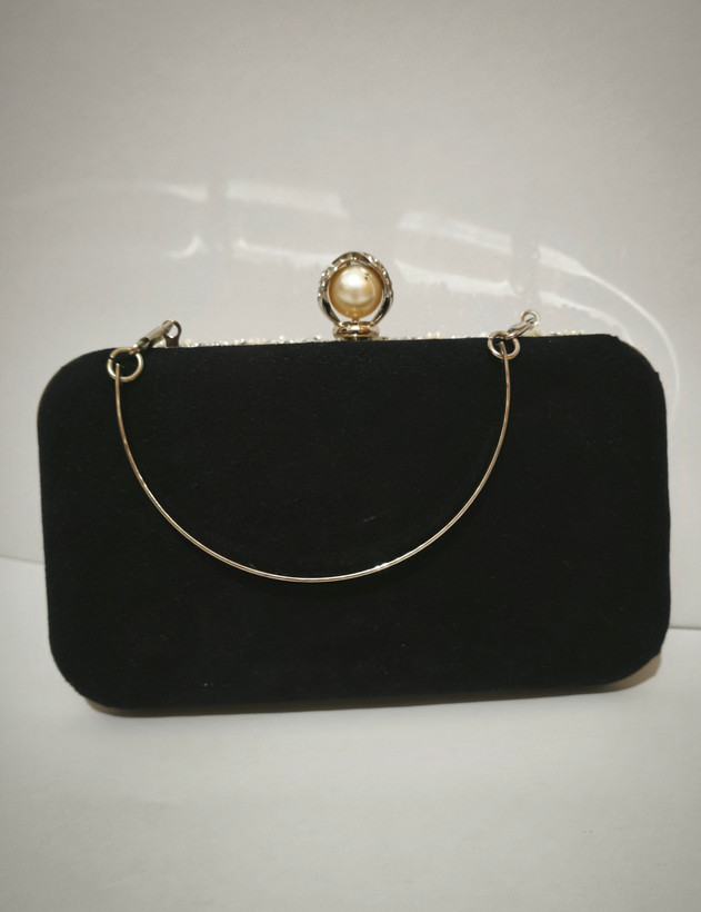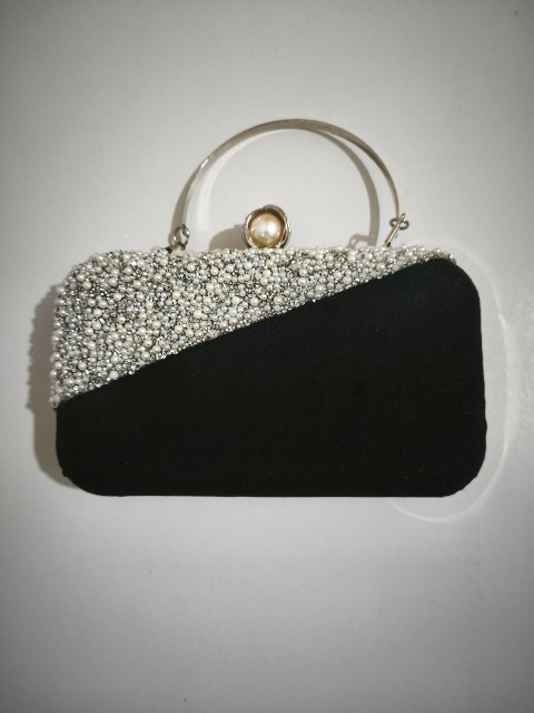 کیف زنانه مجلسی مشکی دستساز پارچه استفاده شده مخمل هست که روی کار سنگ و مروارید کار شده دارای دسته نقره ای هست رنگ یراق و دسته نقره ی ثابت هست داخل کیف پارچه آستری اشبالت هست سگک کیف حالت صدف مرواریدی هست: 1