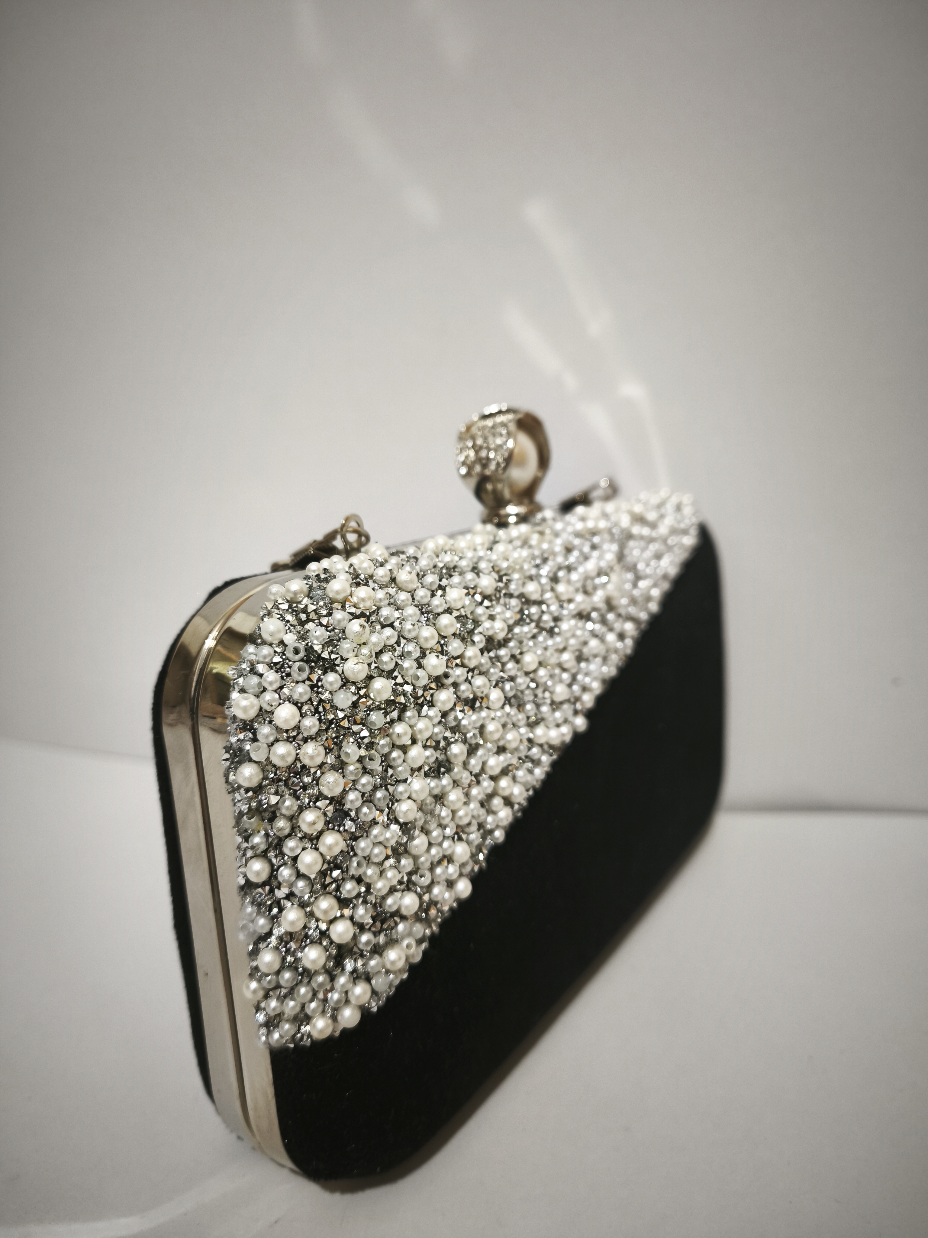 کیف زنانه مجلسی مشکی دستساز پارچه استفاده شده مخمل هست که روی کار سنگ و مروارید کار شده دارای دسته نقره ای هست رنگ یراق و دسته نقره ی ثابت هست داخل کیف پارچه آستری اشبالت هست سگک کیف حالت صدف مرواریدی هست: 1