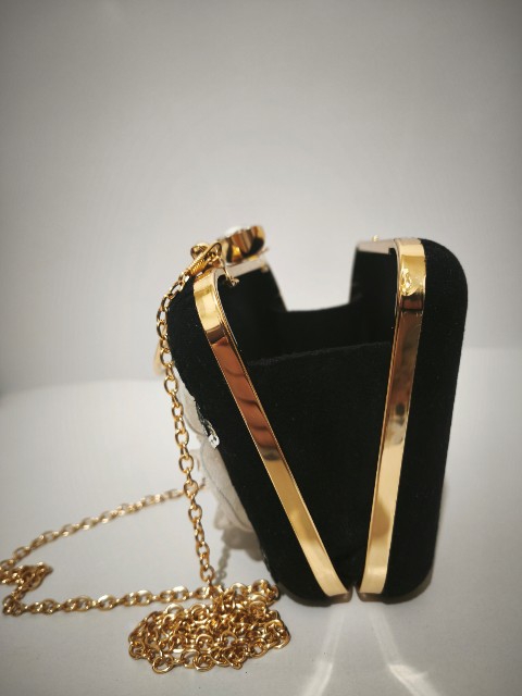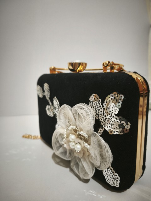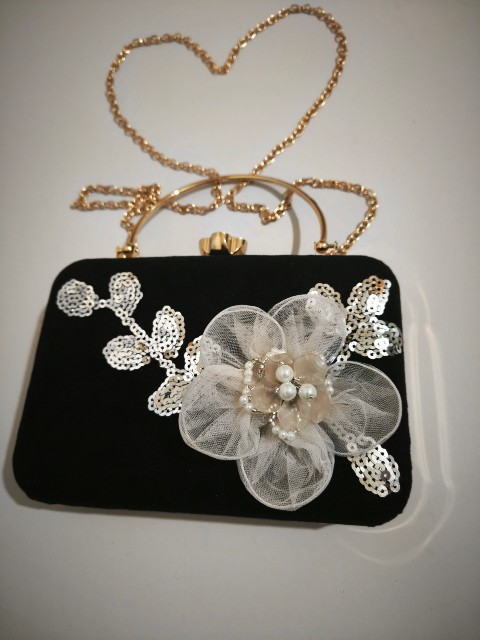 کیف دست ساز جنس پارچه کار شده مخمل مشکی جاسمین هستش داخل کیف پارچه آستری اشبالت به کار رفته مناسب مجالس و مهمانی ها رویه کار گل برجسته رنگ شیری توری هست که با پولک تزیین شده: 1